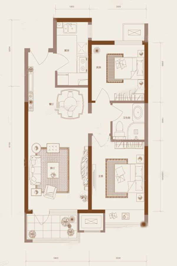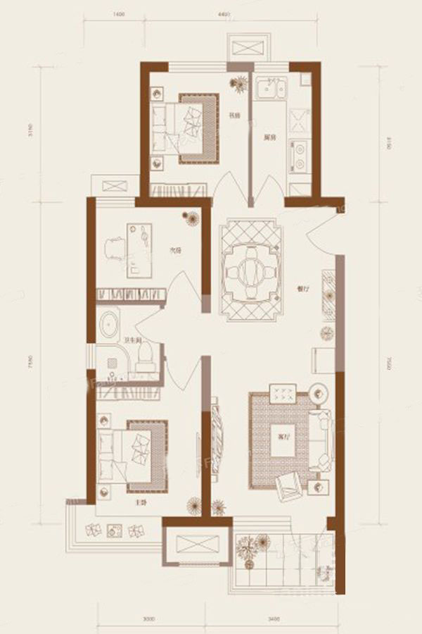 各个空间户型方正,后期空间利用率高;整个空间全明通透,采光良好,同时利于居住空间通风;整个户型空间布局合理,做到了干湿分离、动静分离,方便后期生活;客厅、卧室、卫生间和厨房等主要功能间的尺寸以及比例适中,有利于采光和通风,居住起来舒适、方便。