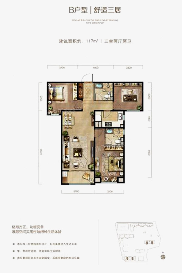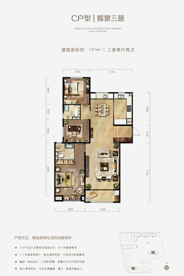 整体户型方正,活动区域开阔,居住舒适度高;全明通透户型,居住舒适度较高,整个空间采光充足,利于后期居住;整体空间布局合理,能够保证动静分离和居室通风,方便使用;客厅、卧室、卫生间和厨房等主要功能间的尺寸以及比例适中,有利于采光和通风,居住起来舒适、方便。