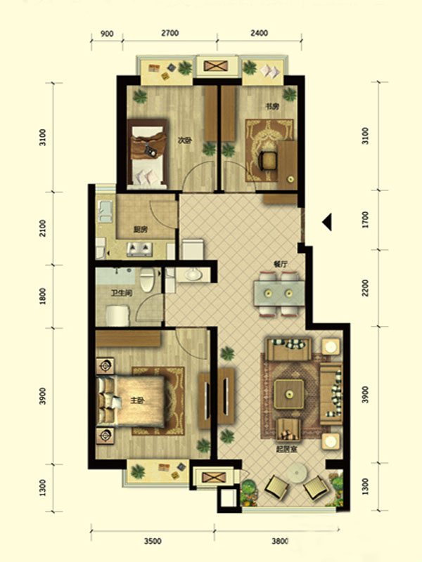 各个空间户型方正,后期空间利用率高;全明通透户型,居住舒适度较高,整个空间采光充足,利于后期居住;整个户型空间布局合理,做到了干湿分离、动静分离,方便后期生活;客厅、卧室、卫生间和厨房等主要功能间的尺寸以及比例适中,有利于采光和通风,居住起来舒适、方便;公摊高于15%且低于25%,符合住宅公摊正常范