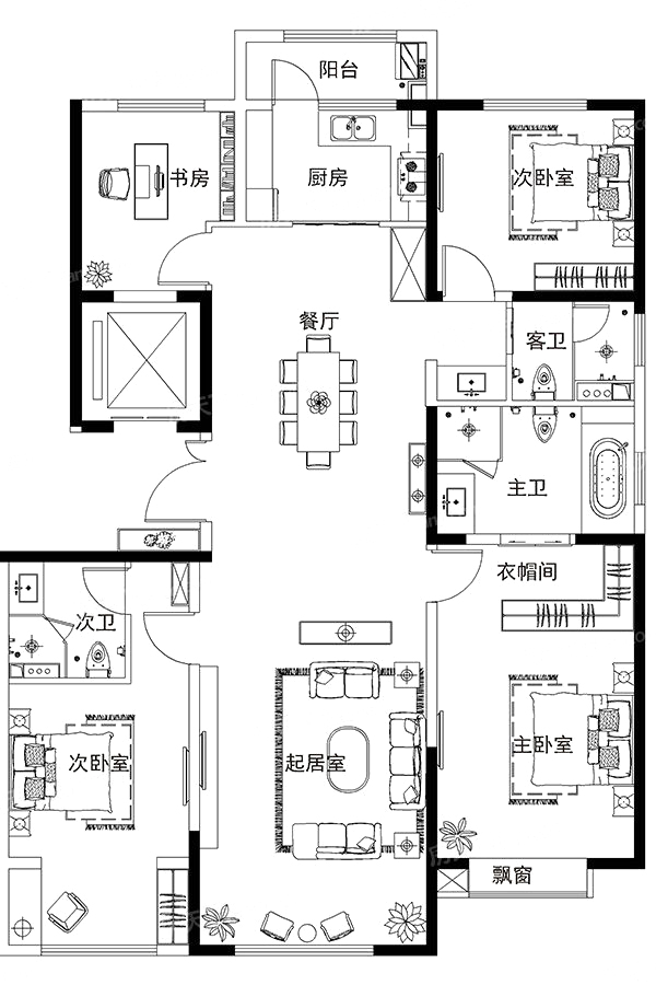 “3+1”套房设计,南向主次卧均为套间设计,均带衣帽间。主卧独卫,客卫分离。南向客厅超大面宽,带观景阳台。北向次卧与书房可分可合,灵活自如。厨房可做中西餐,厨房带储物阳台,实用性强。